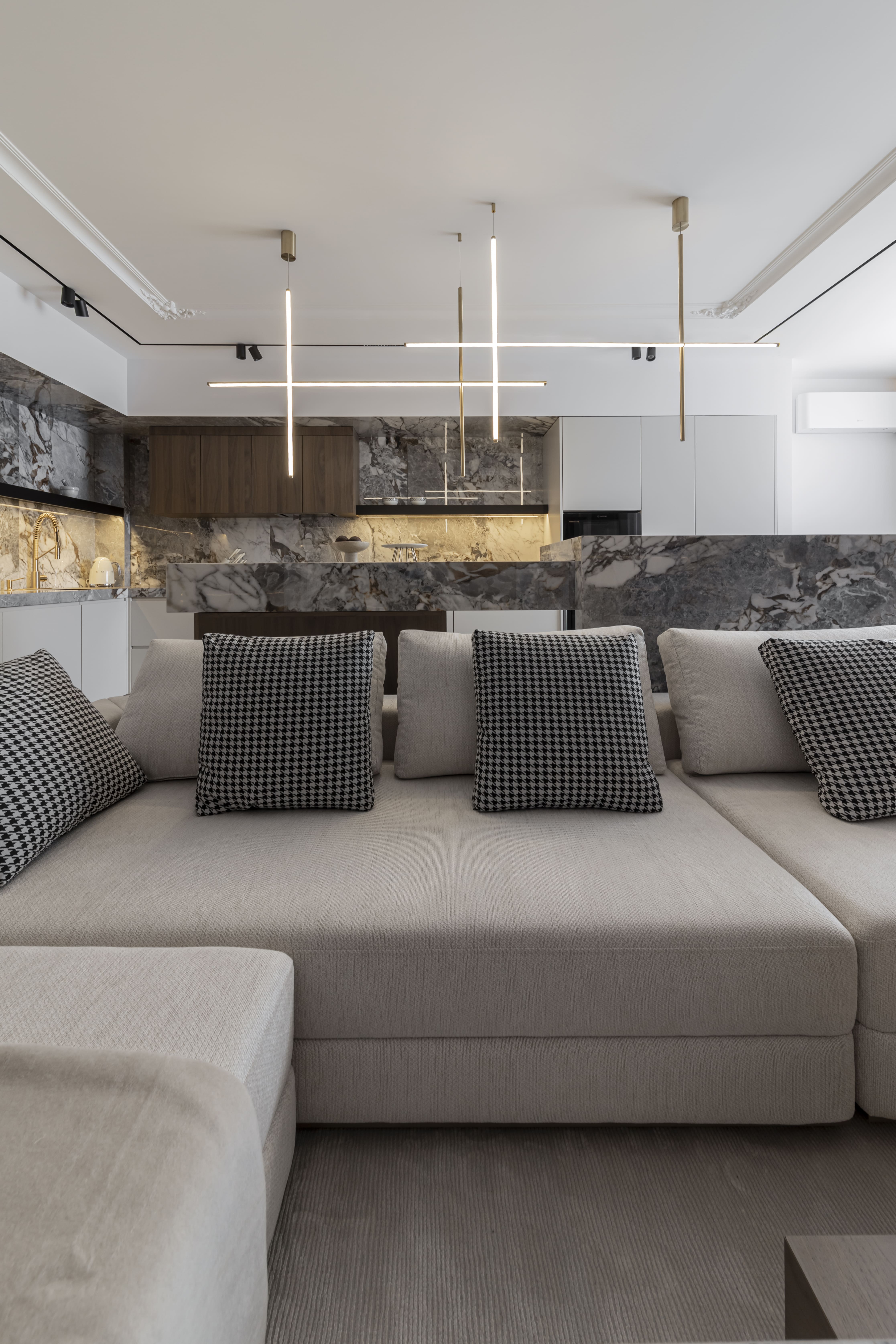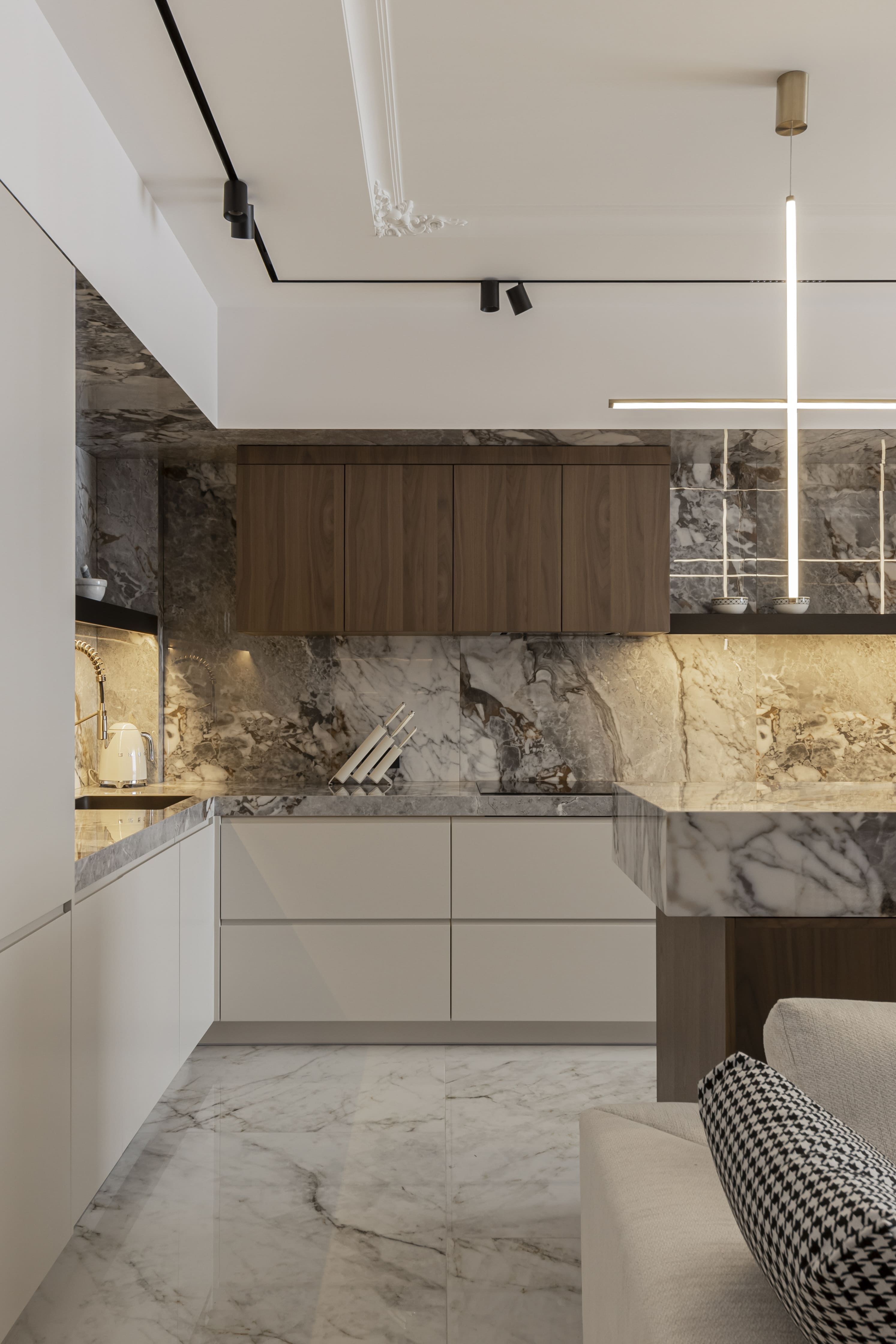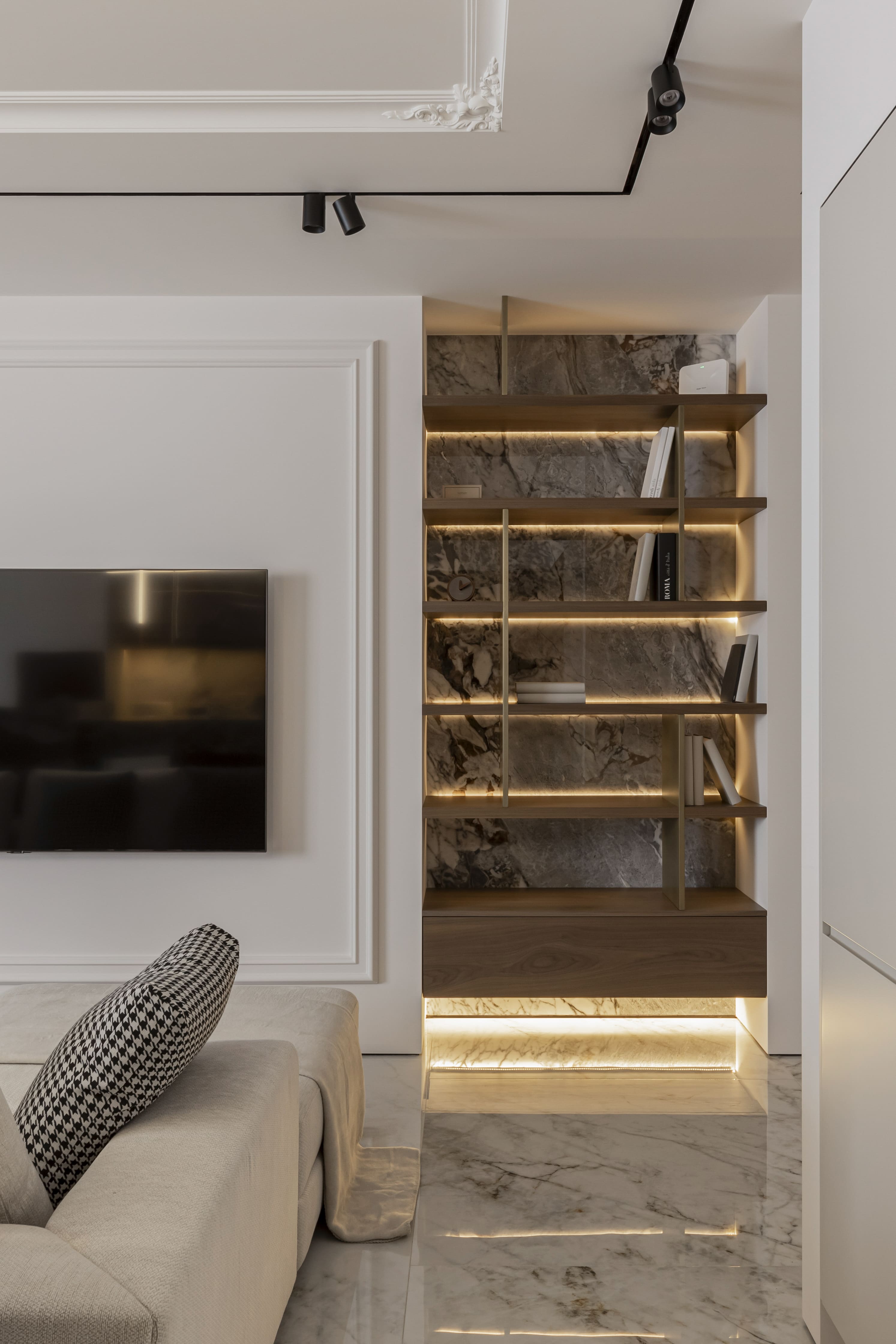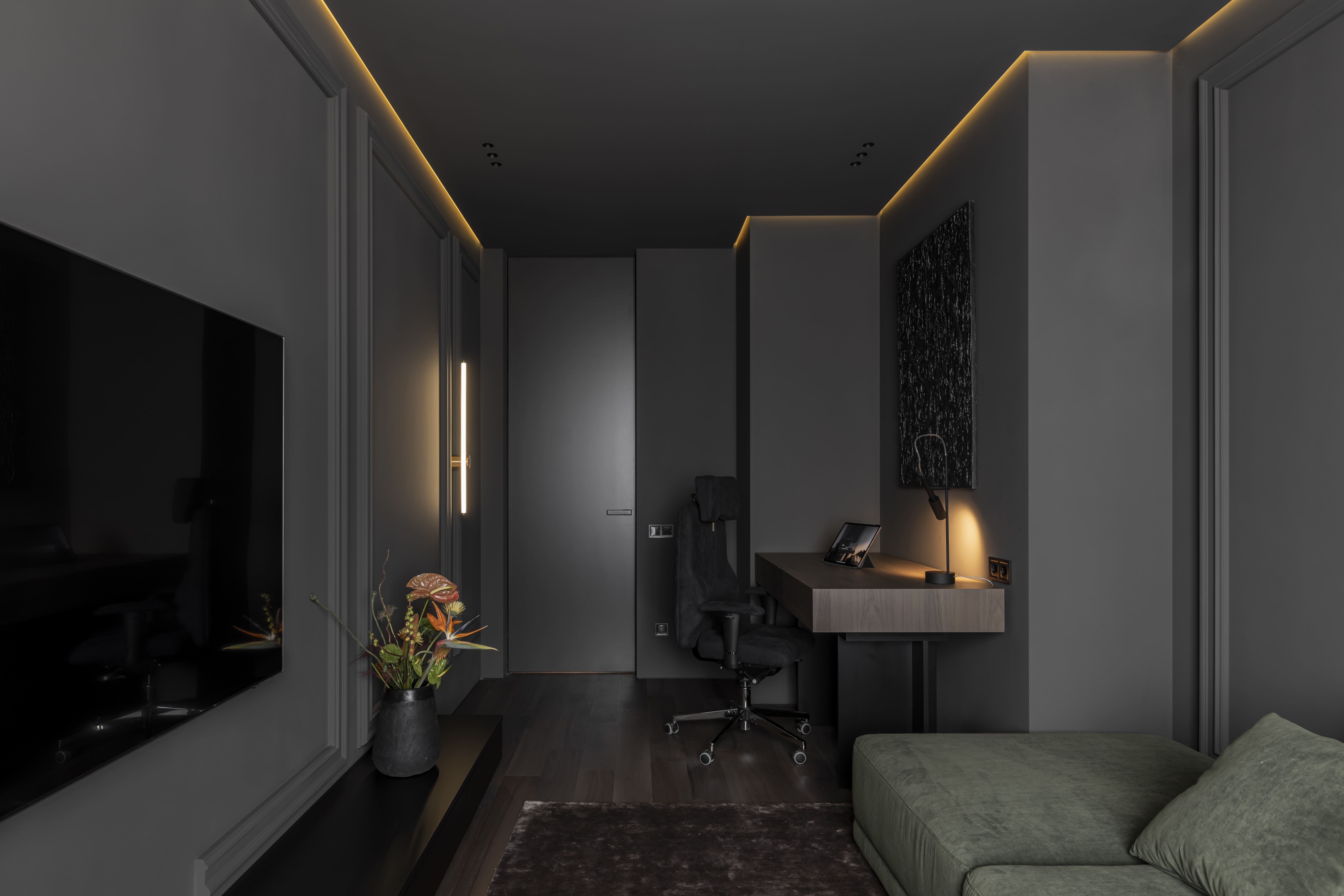 Цей інтер’єр втілює суть напрямку CLASSIC CAVE — сучасне переосмислення класики. Ми поєднали чітку геометрію, природні фактури та делікатне світло з класичним декором: молдингами, розетками та симетрією. Простір наповнений витонченістю, балансом і стриманою естетикою, де класика не домінує, а інтегрується у сучасний контекст.