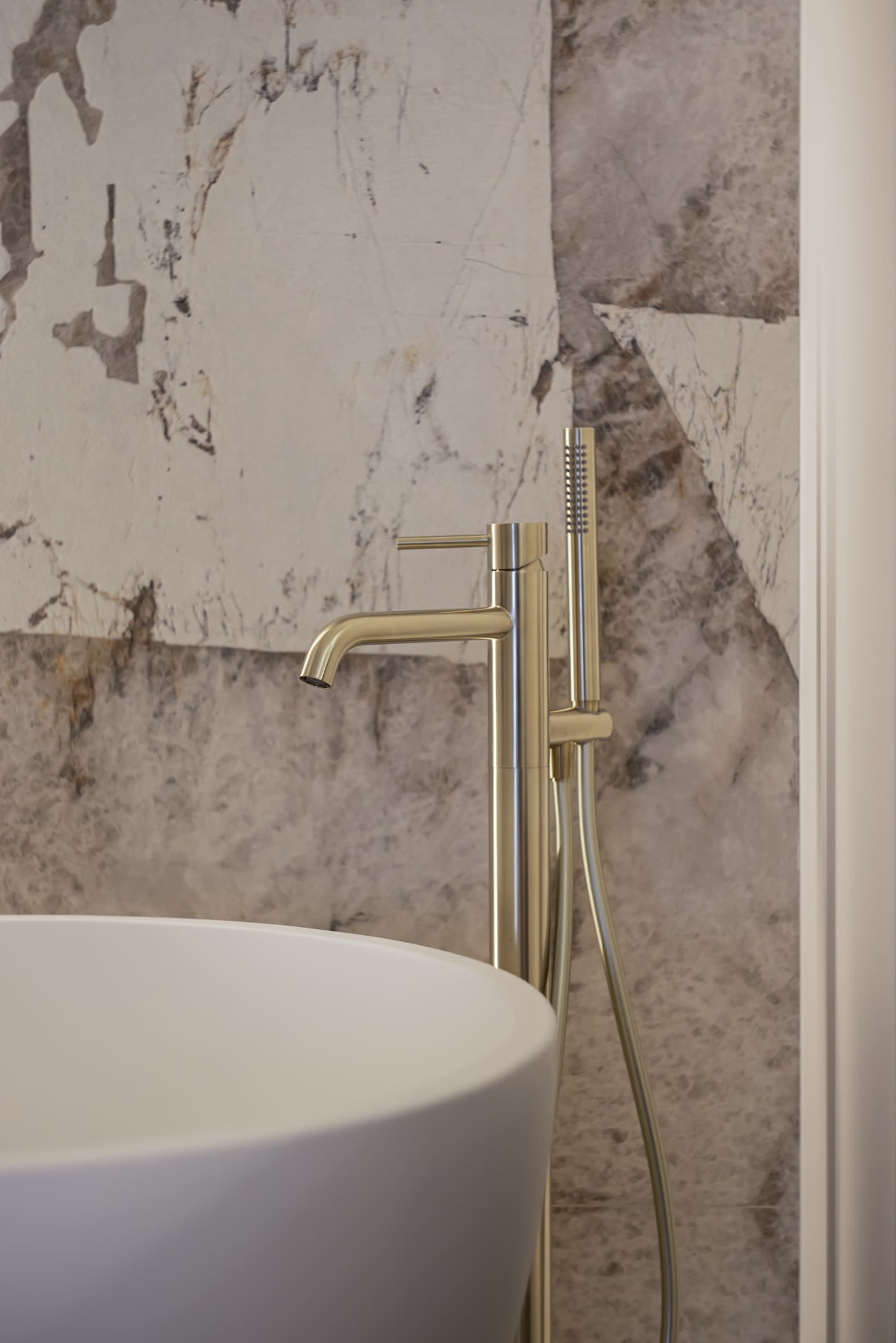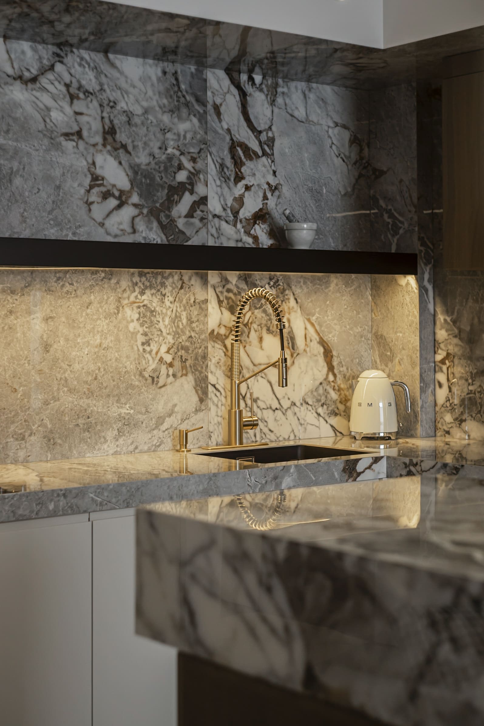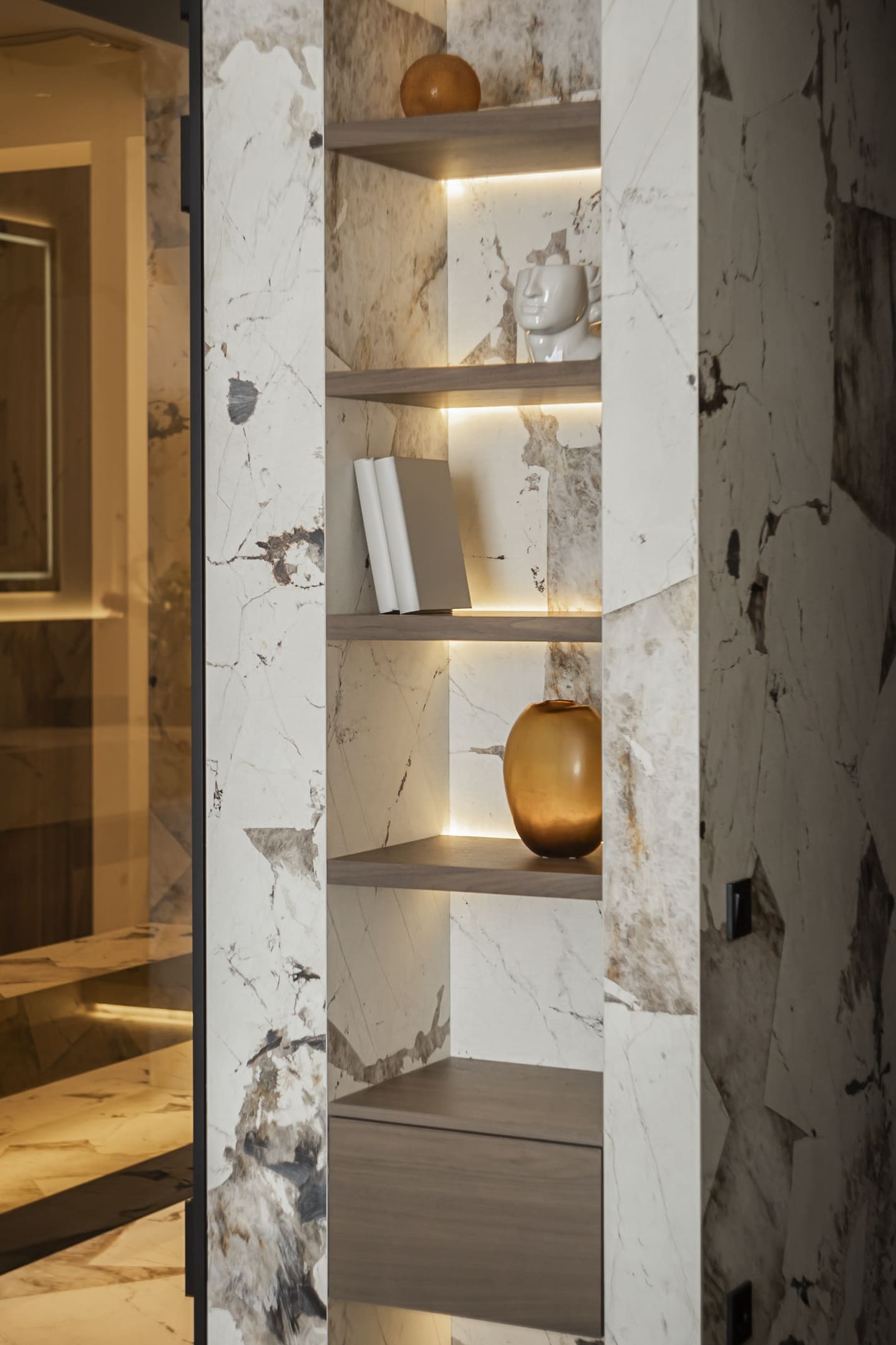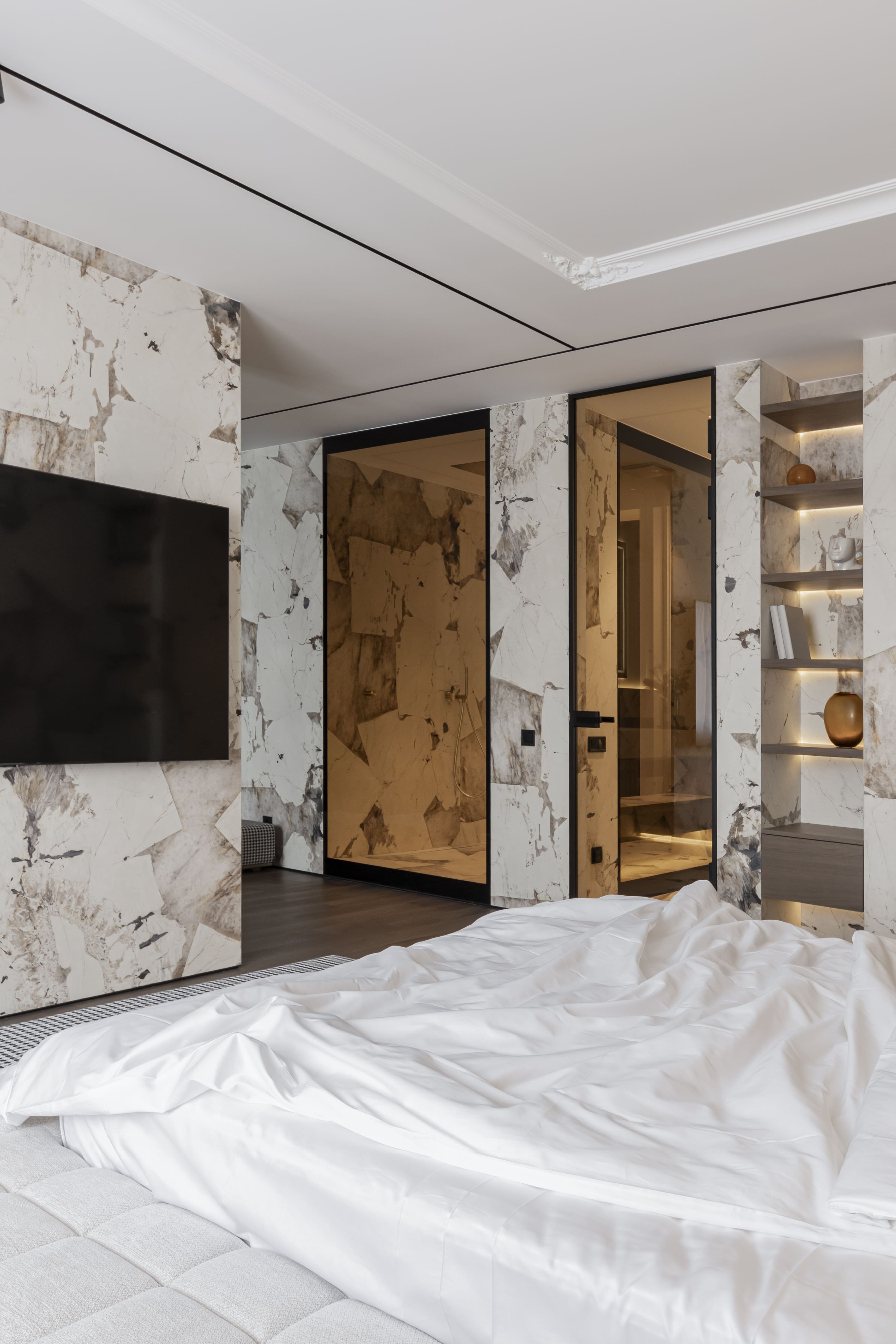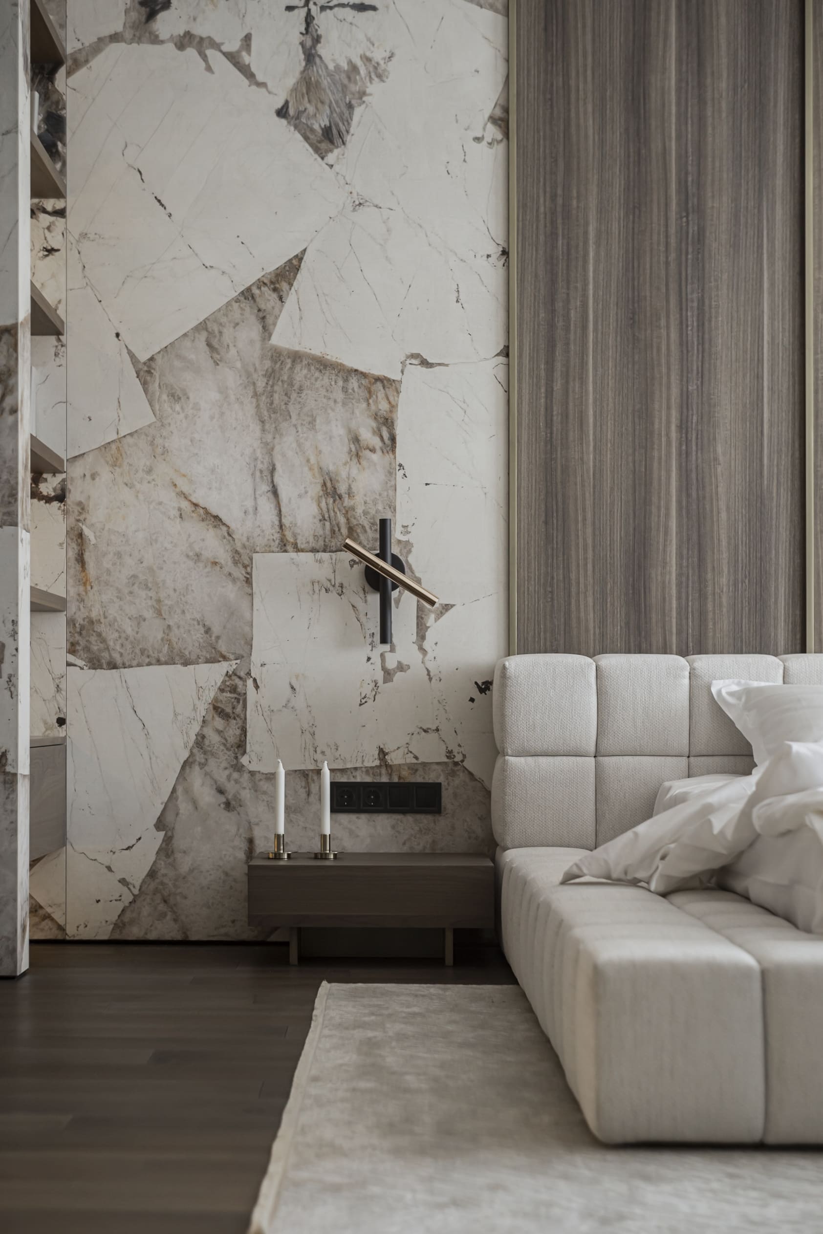 Матеріальна палітра ґрунтується на контрасті: текстурний камінь Patagonia, шпон, натуральна латунь, мармурова підлога. Класичний декор виконаний у тон із стінами, що створює цілісність та м’яку глибину простору. Усі матеріали підібрані з акцентом на автентичність, тактильність і простоту.