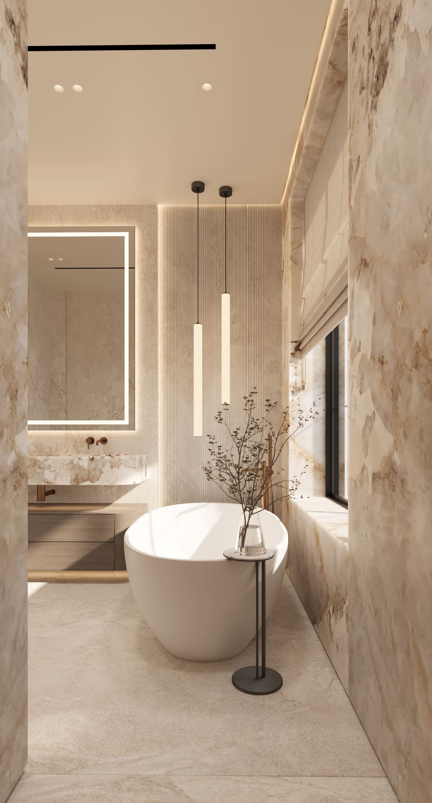 В основі — теплий натуральний камінь із багатим малюнком, який використано для облицювання меблів, стін і підлогових площин. Світле дерево додає природного звучання, текстиль та штукатурки — тактильності. Палітра матеріалів зібрана навколо світлих, м’яких тонів, що створюють обволікаюче середовище й працюють як єдиний просторовий масив.
