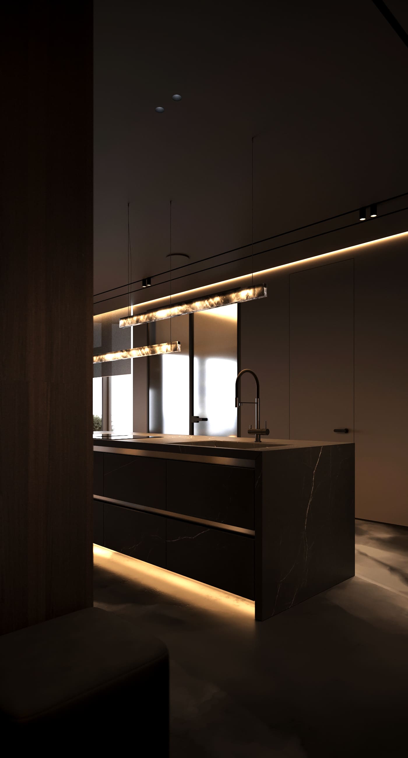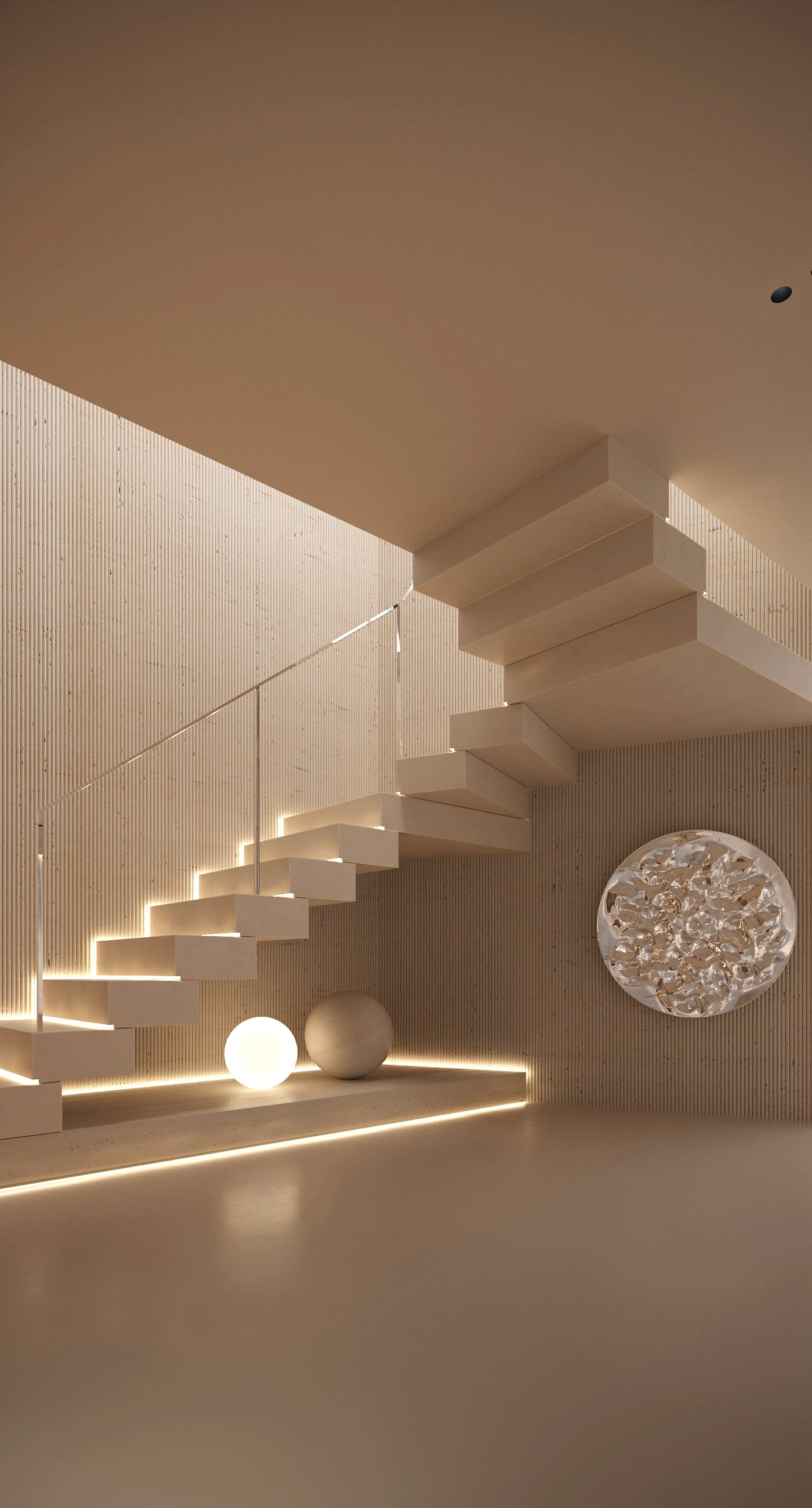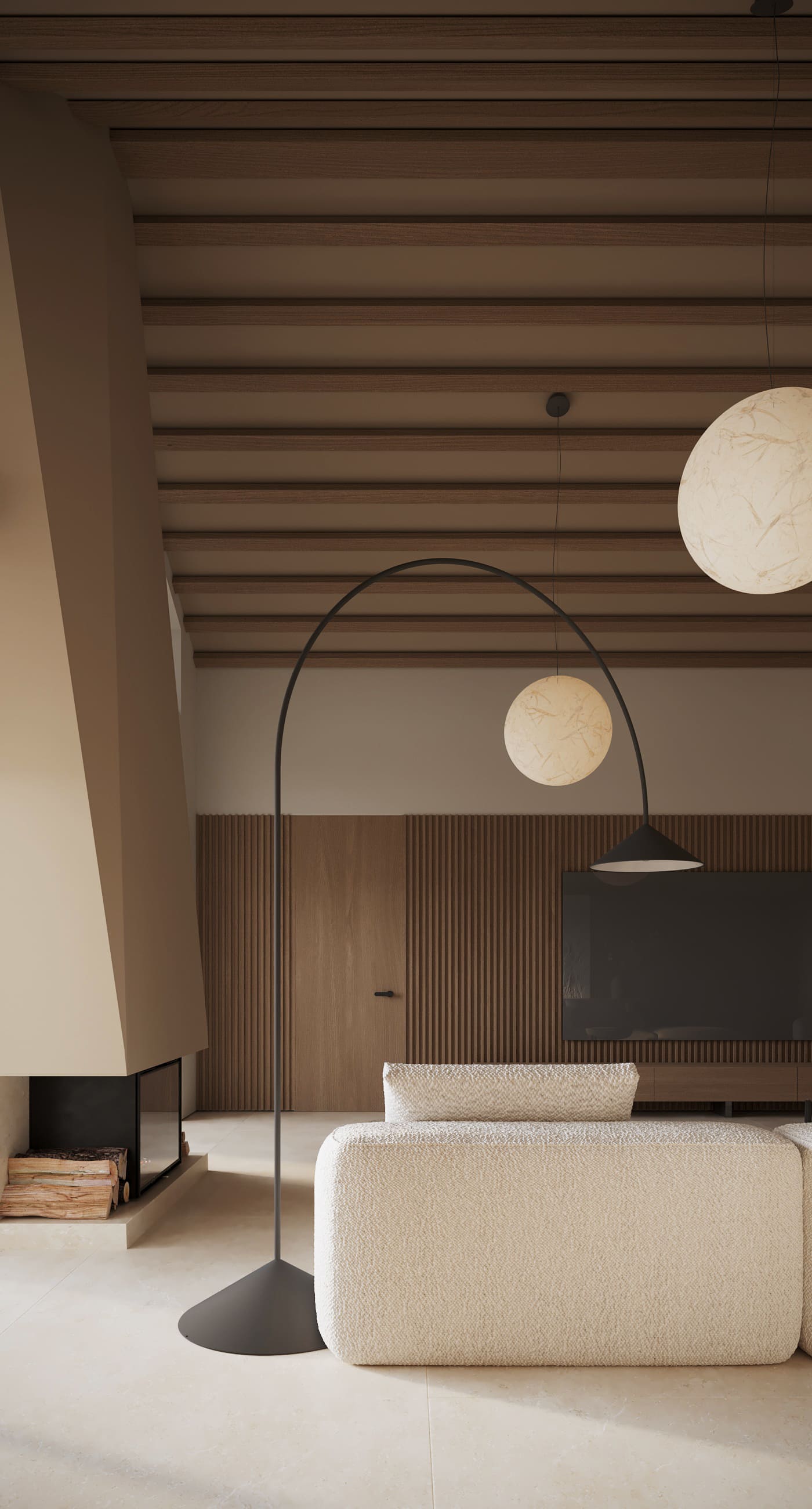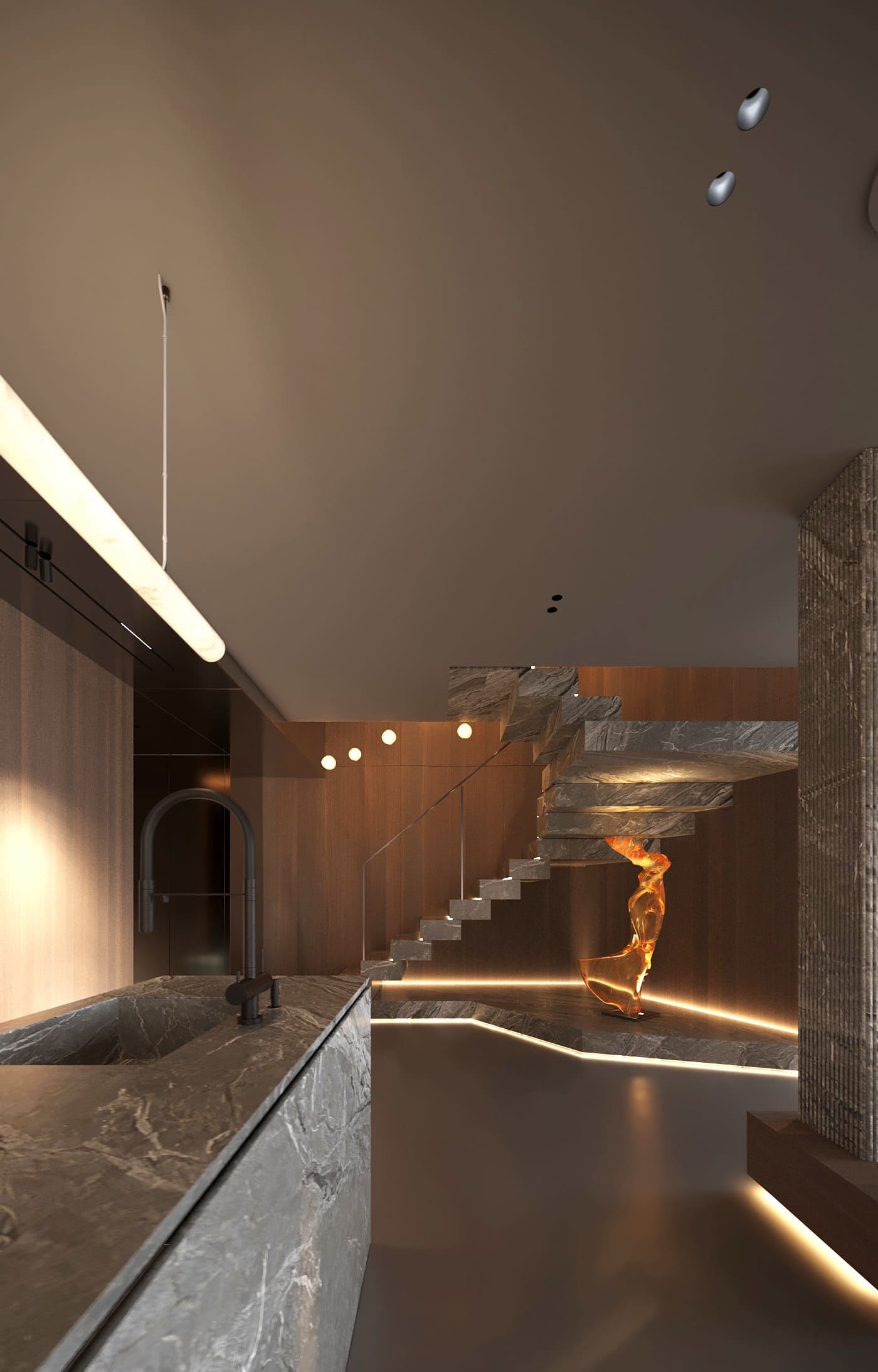 На першому (підвальному) рівні розміщено технічні приміщення, спортзал та кабінет — зони, які потребують відокремлення та концентрації. Другий рівень (перший поверх) об'єднує соціальні простори: кухню, їдальню та вітальню з виходом на терасу. Простір відкритий, динамічний, створений для комунікації та прийому гостей. Третій рівень (другий поверх) — приватна зона зі спальнями, гардеробними і ванними кімнатами, організована навколо центрального холу, що дає змогу зберігати відчуття спокою та ритму.